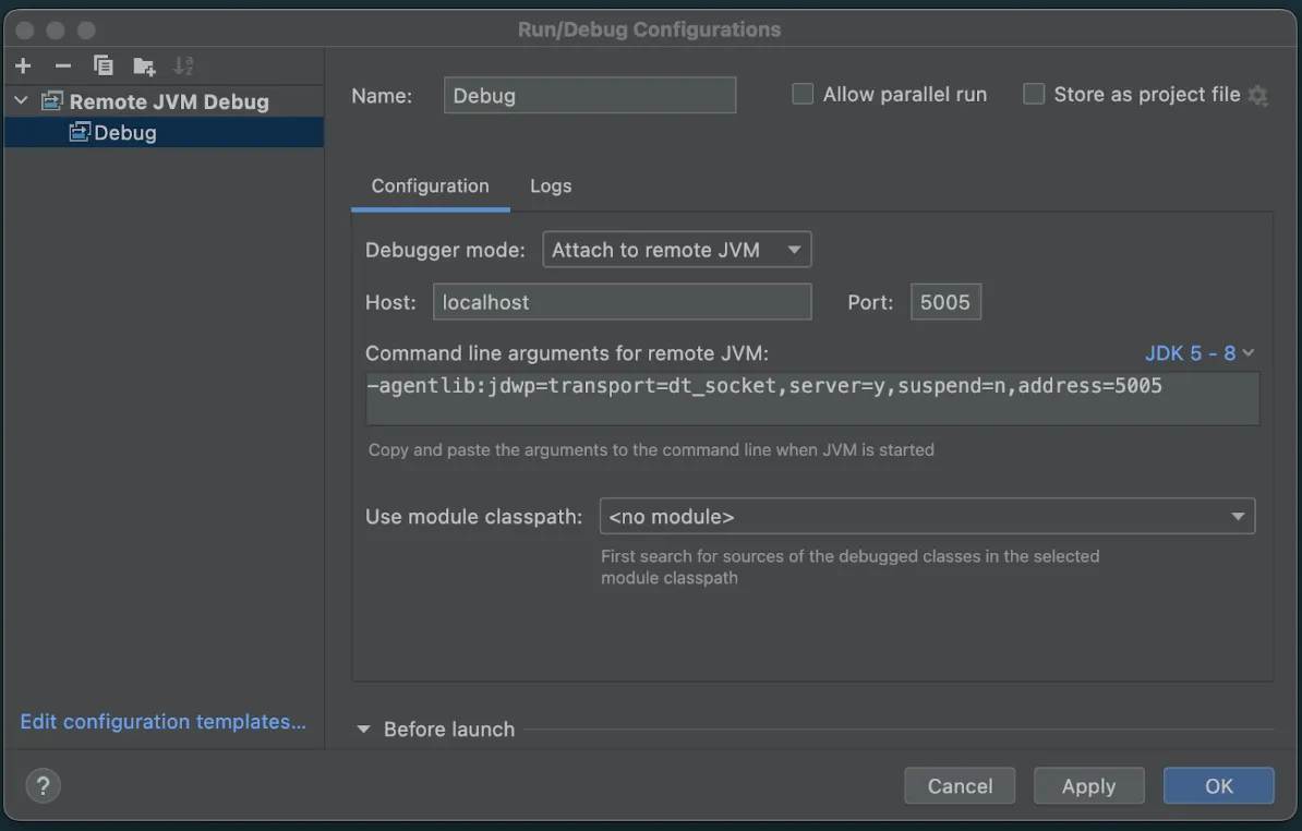 -agentlib:jdwp=transport=dt_socket,server=y,suspend=n,address=5005