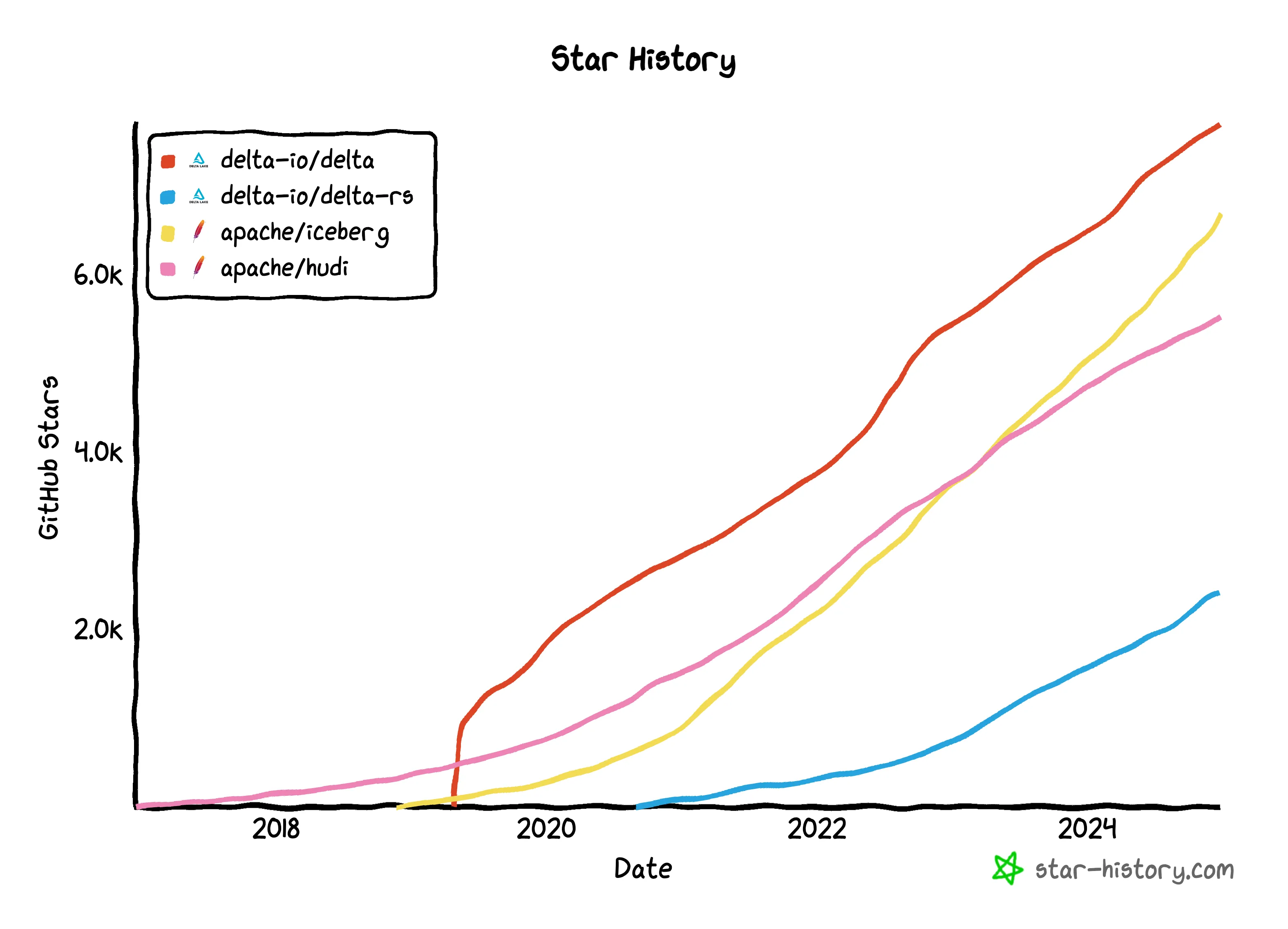 Delta Lake is a popular open table format. There are also other open table formats, like Apache Iceberg and Apache Hudi.
